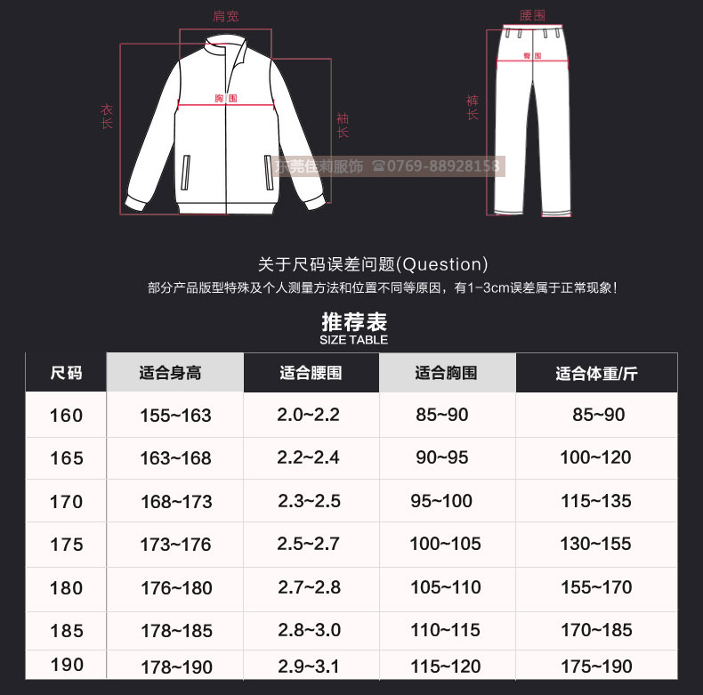 155(S)、165(M)、170(L)、175(XL)、180(XXL)、185(XXL)